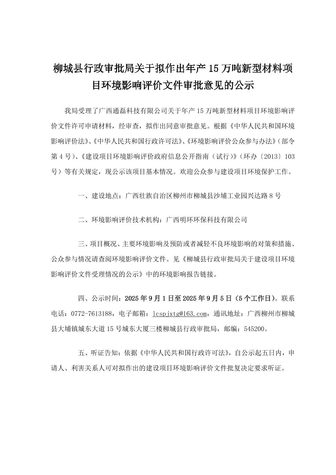 柳城縣行政審批局關(guān)于擬作出年產(chǎn)15萬(wàn)噸新型材料項(xiàng)目環(huán)境影響評(píng)價(jià)文件審批意見(jiàn)的公示